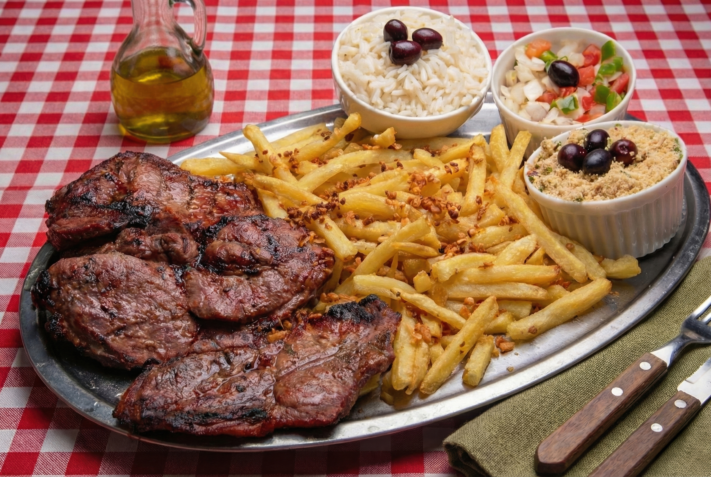 Bifes de copalombo temperados em vinho e assados na brasa. Acompanha batata frita, farofa, arroz branco e molho à campanha.